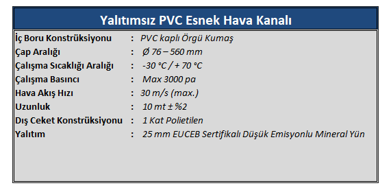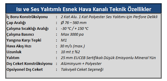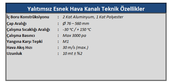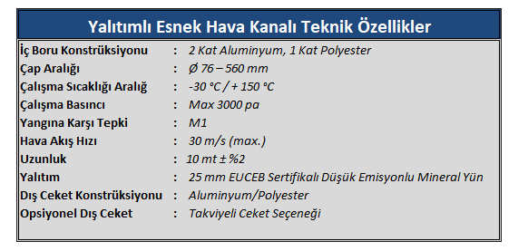 | ** Esnek Hava Kanalları kullanım alanlarına göre çeşitlilik gösterirler. Alüminyum, PVC ve Polyester malzemelerden izoleli (düşük emisyonlu mineral yün) ve izolesiz olarak üretilmektedir. |